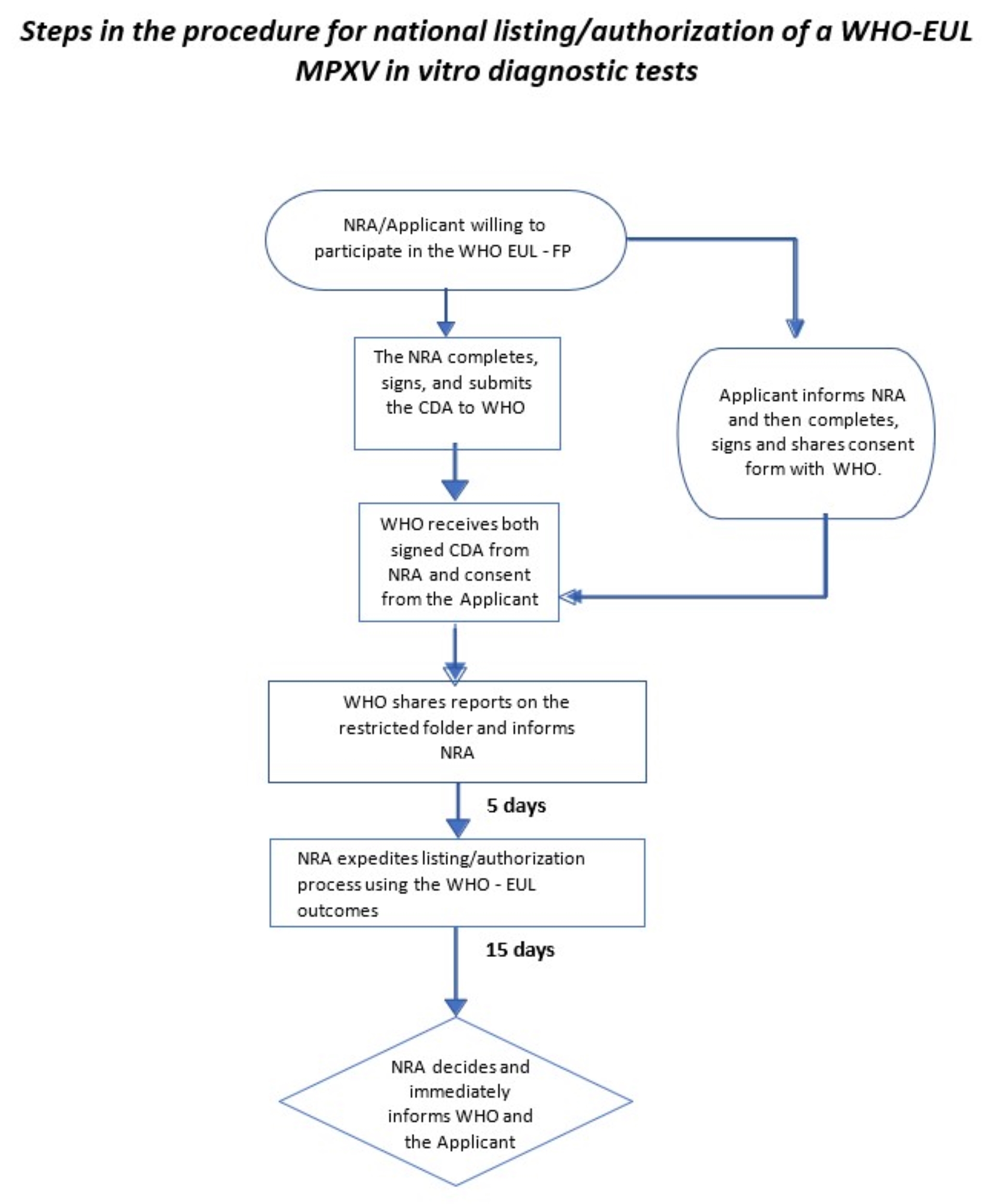 Through close collaboration, NRAs will benefit from capacity building, streamlined authorization processes for MPXV IVDs, minimize duplication of efforts, expedites listing or authorization and improves access to these critical products, supporting public health protection during outbreaks in Member States. Flow chart summarizing the steps of the WHO Facilitated Procedure (WHO- FP MPXV IVDs) mechanism and Confidentiality Undertaking by NRAs (for Mpox Products Only) is provided. If you have any questions, please write to prequalreg@who.int